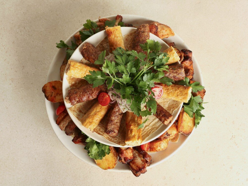 Люля из курицы и телятины, куриное филеи бедро, куриные крылышки, ребрышки свиные, шейка свиная, картофель печеный с салом