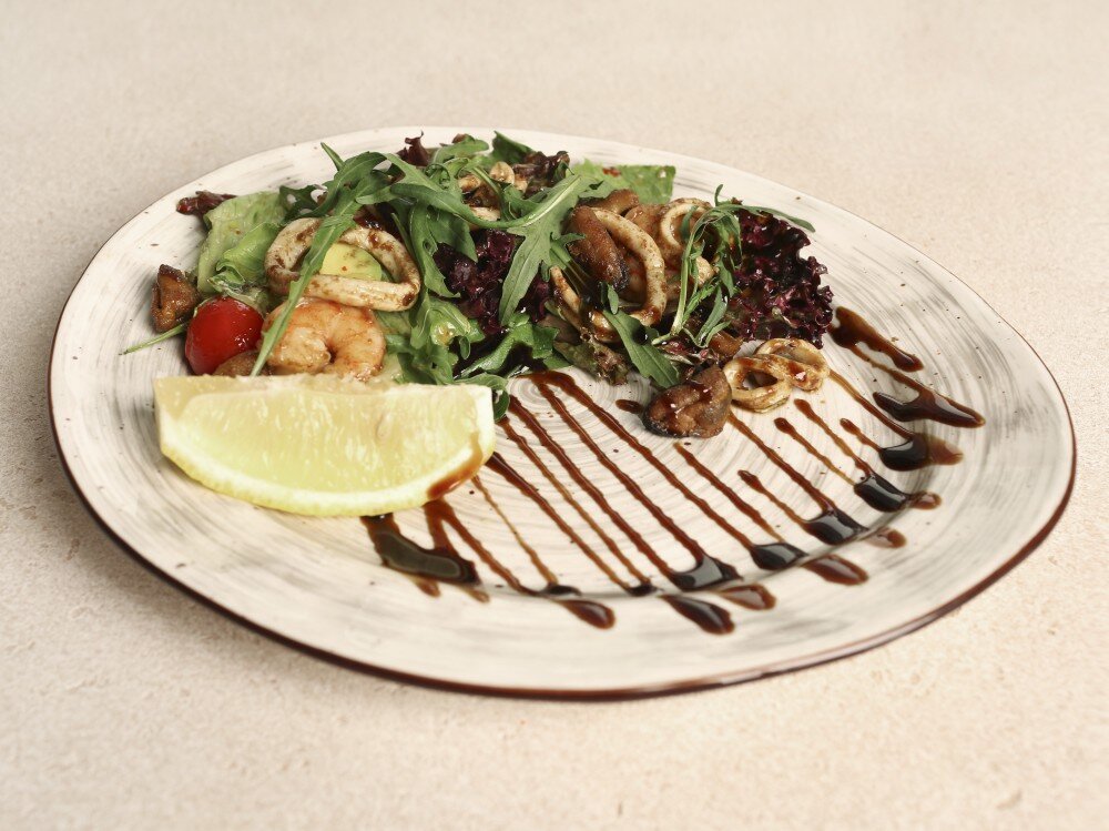 Креветки, мидии, кальмар, помидоры черри, микс листьев салата, тайская заправка