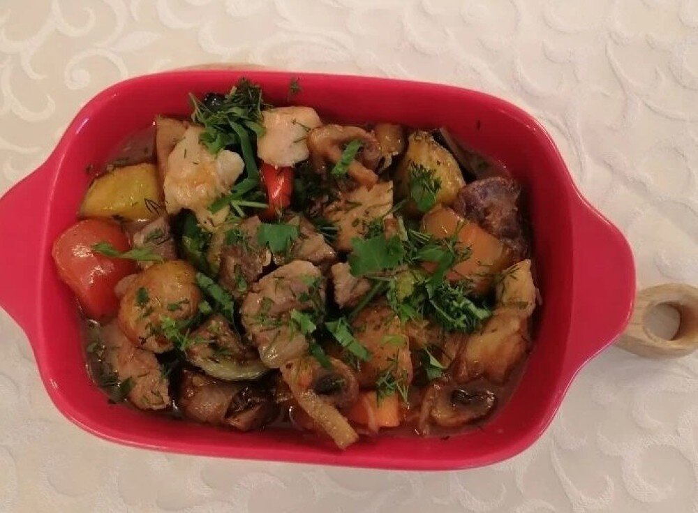 Свинина, говядина вырезка, куриное филе, болгарский перец, цукини, баклажаны, шампиньоны, картофель