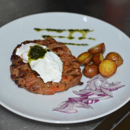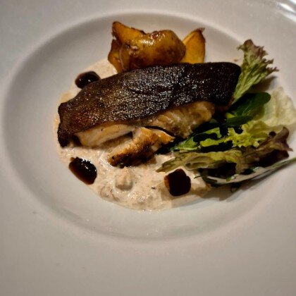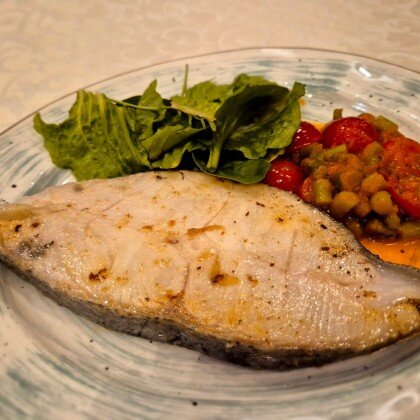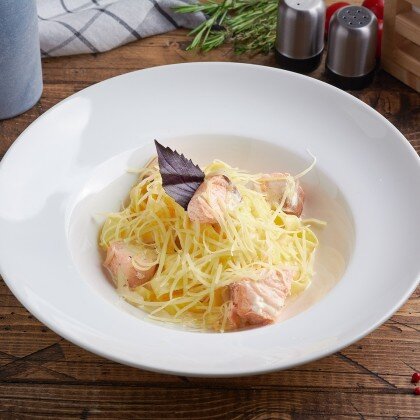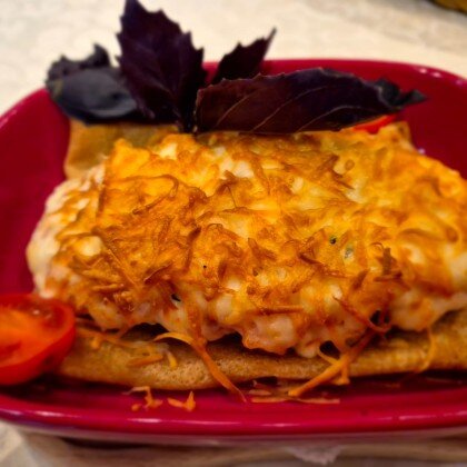 Семга запечённая на блине под соусом бешамель, с креветками и сыром