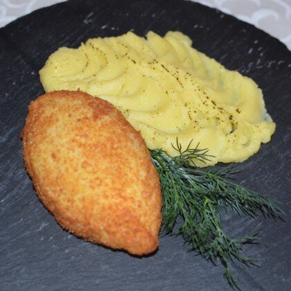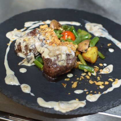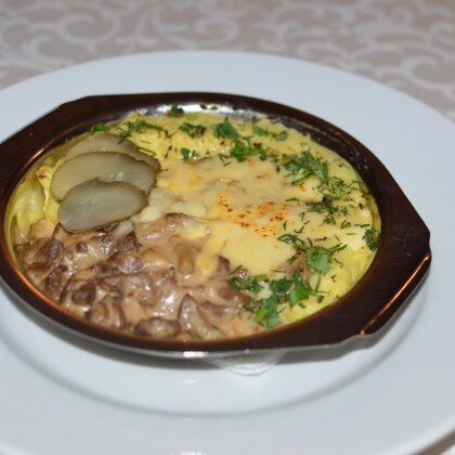 Говядина по Строгановски в сливочном соусе с грибами и картофельным пюре